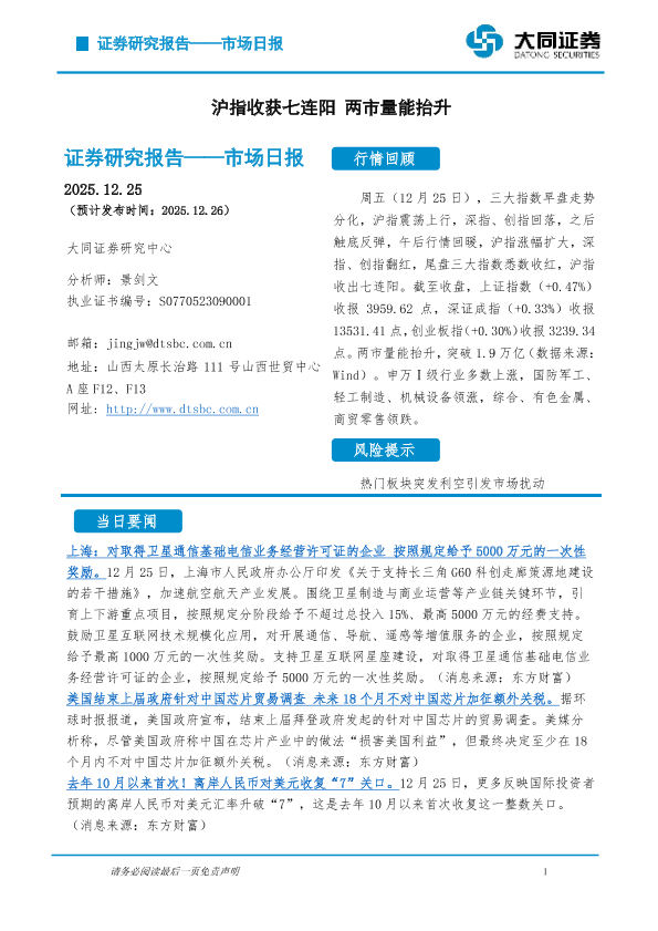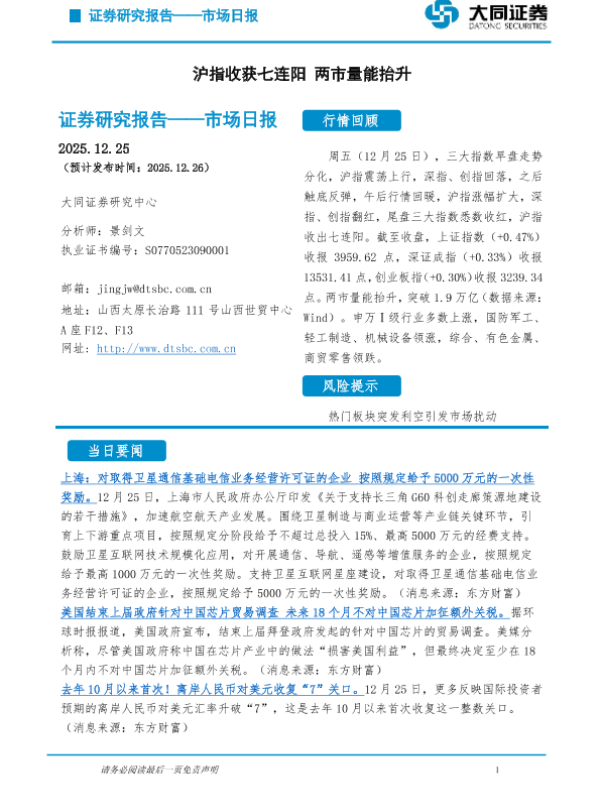 【大同证券研究中心】【202512】市场日报:沪指收获七连阳 两市量能抬升-5页