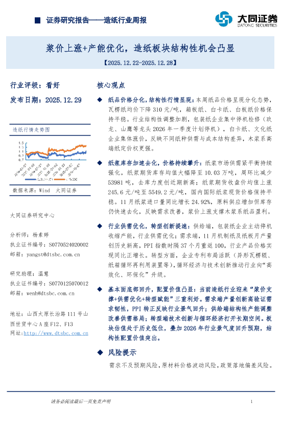 【大同证券研究中心】【202512】浆价上涨+产能优化,造纸板块结构性机会凸显-10页