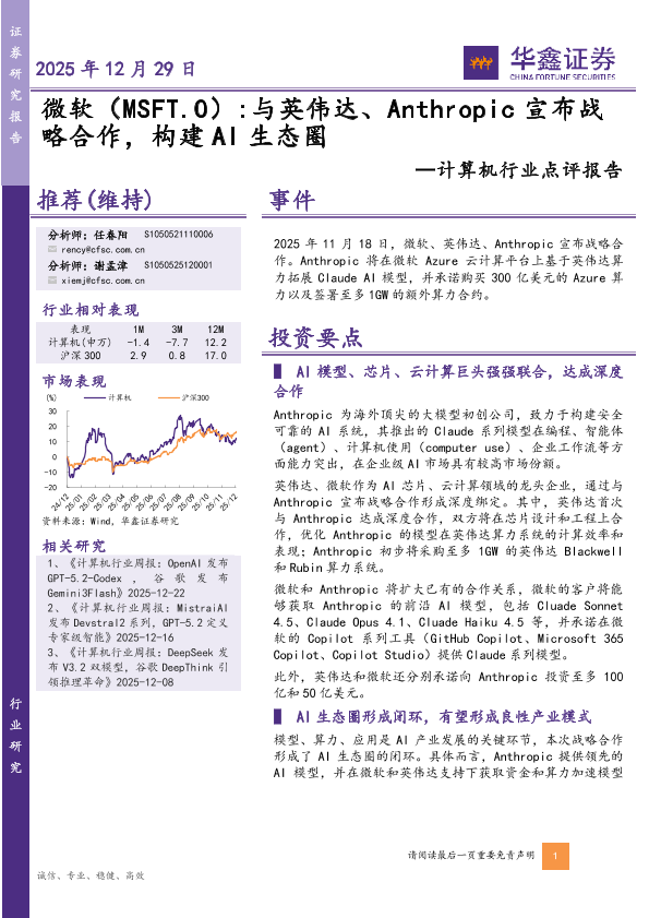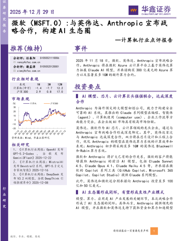 【华鑫证券】【202512】微软:与英伟达、Anthropic宣布战略合作,构建AI生态圈-4页