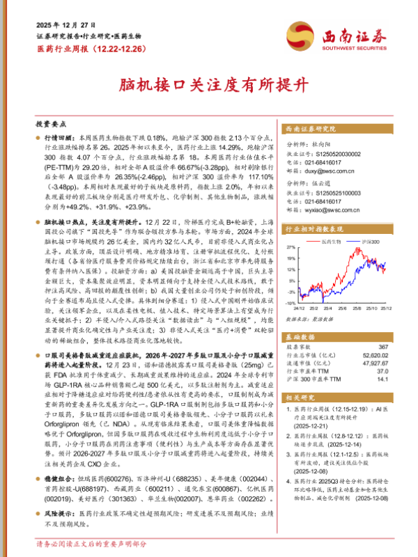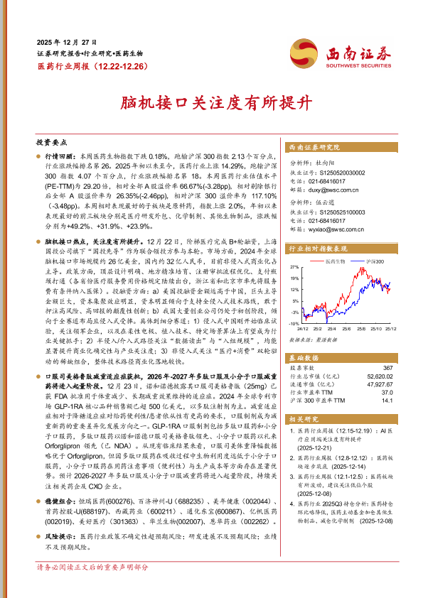 医药行业 口服GLP-1 创新药 脑机接口 投资策略