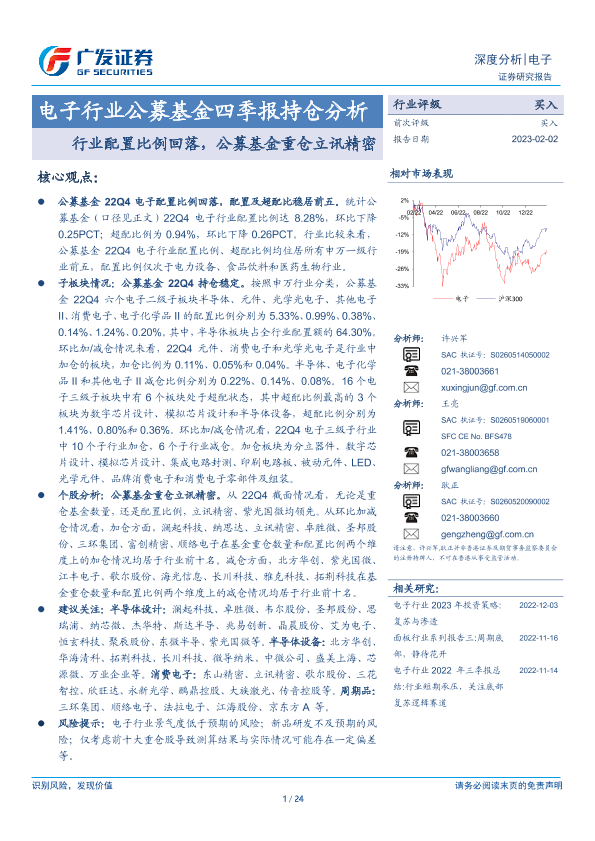 【广发证券】【20230202】电子行业公募基金四季报持仓分析:行业配置比例回落,公募基金重仓立讯精密-24页
