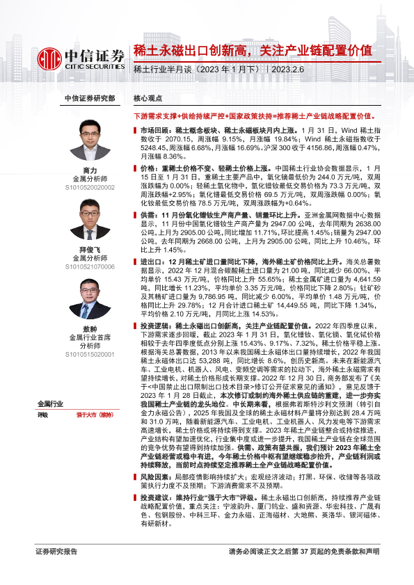 【中信证券】【20230206】稀土行业半月谈(2023年1月下):稀土永磁出口创新高,关注产业链配置价值-38页