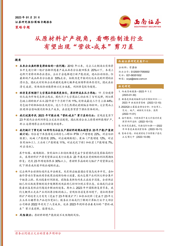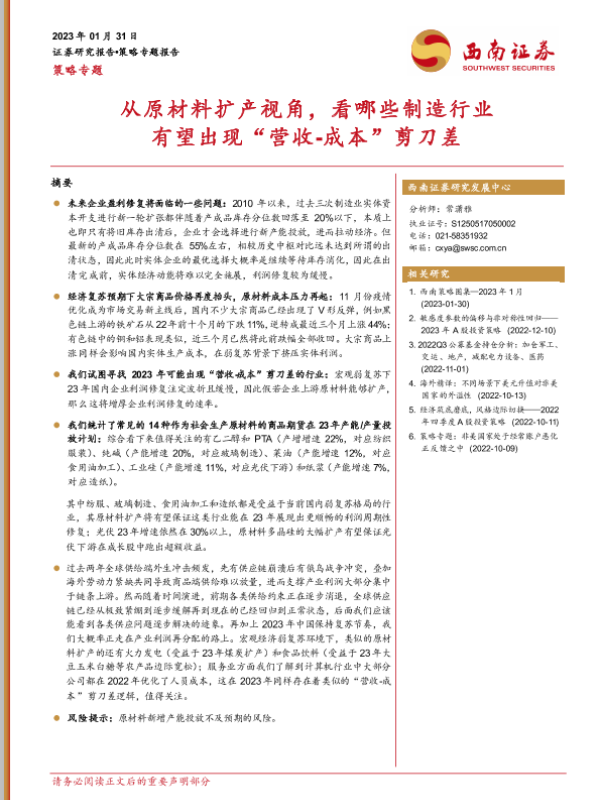【西南证券】【20230131】策略专题:从原材料扩产视角,看哪些制造行业有望出现“营收_成本”剪刀差-29页