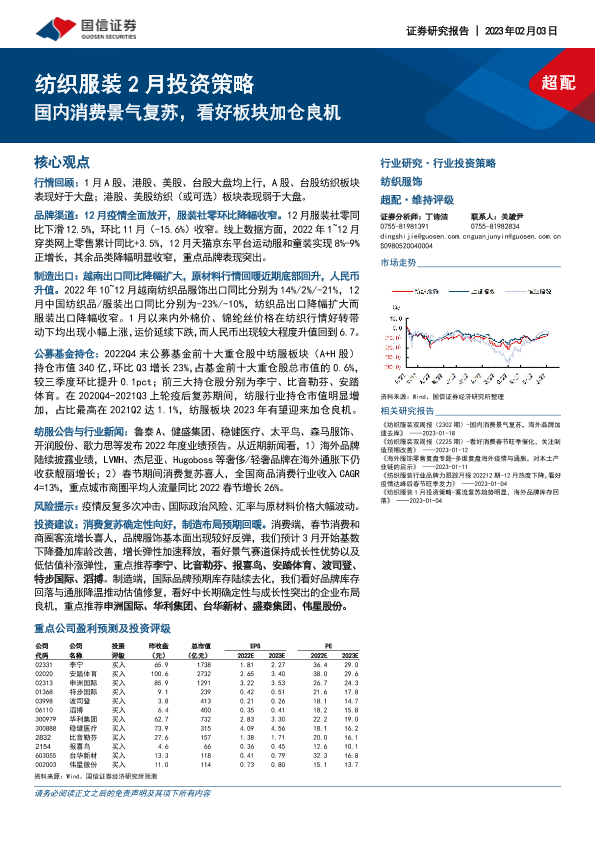 【国信证券】【20230203】纺织服装2月投资策略:国内消费景气复苏,看好板块加仓良机-25页