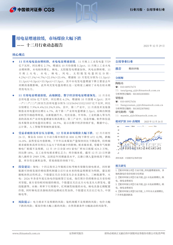 【银河证券】【202512】公用事业行业十二月行业动态报告:用电量增速放缓,市场煤价大幅下跌-16页