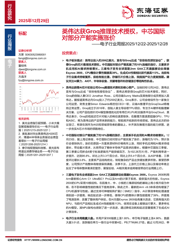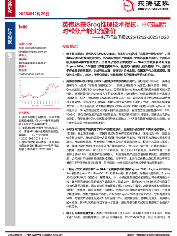 【东海证券】【202512】英伟达获Groq推理技术授权,中芯国际 对部分产能实施涨价——电子行业周报2025/12/22-2025/12/28-14页