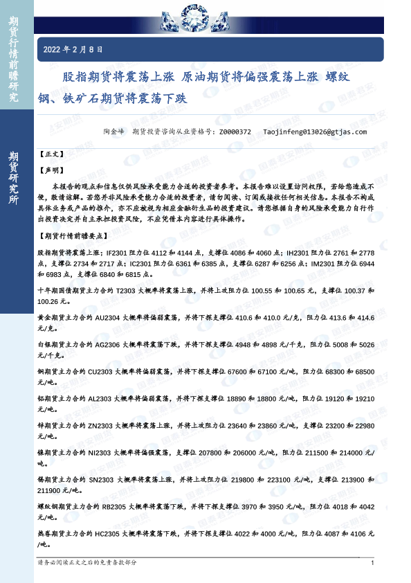 【国泰君安期货】【20230208】股指期货将震荡上涨,原油期货将偏强震荡上涨,螺纹钢、铁矿石期货将震荡下跌-40页