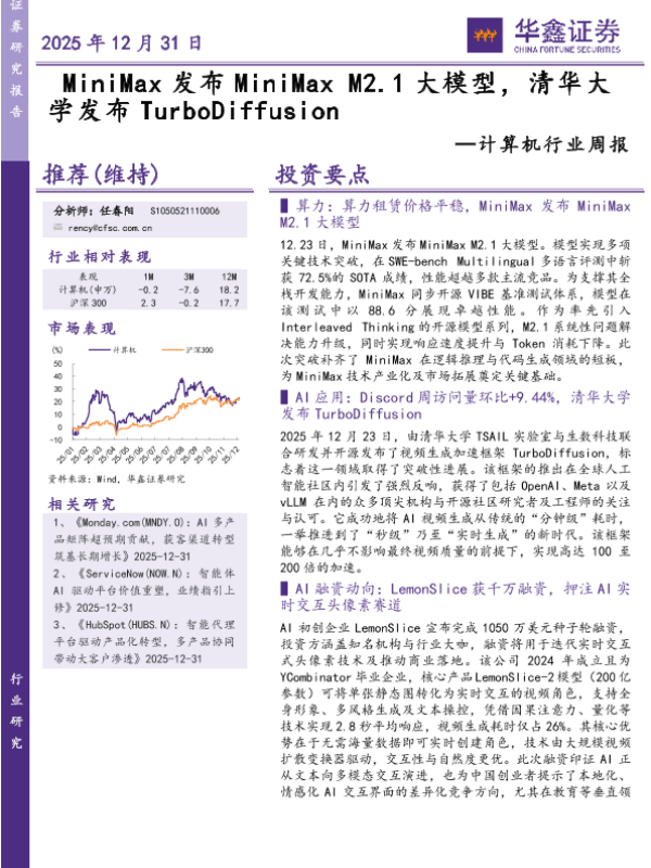 【华鑫证券】【202512】计算机行业周报:MiniMax发布MiniMax M2.1大模型,清华大学发布TurboDiffusion-18页