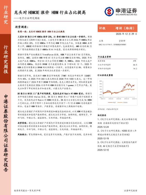 【申港证券】【202512】龙头对HBM3E涨价 HBM行业占比提高——电子行业研究周报-12页