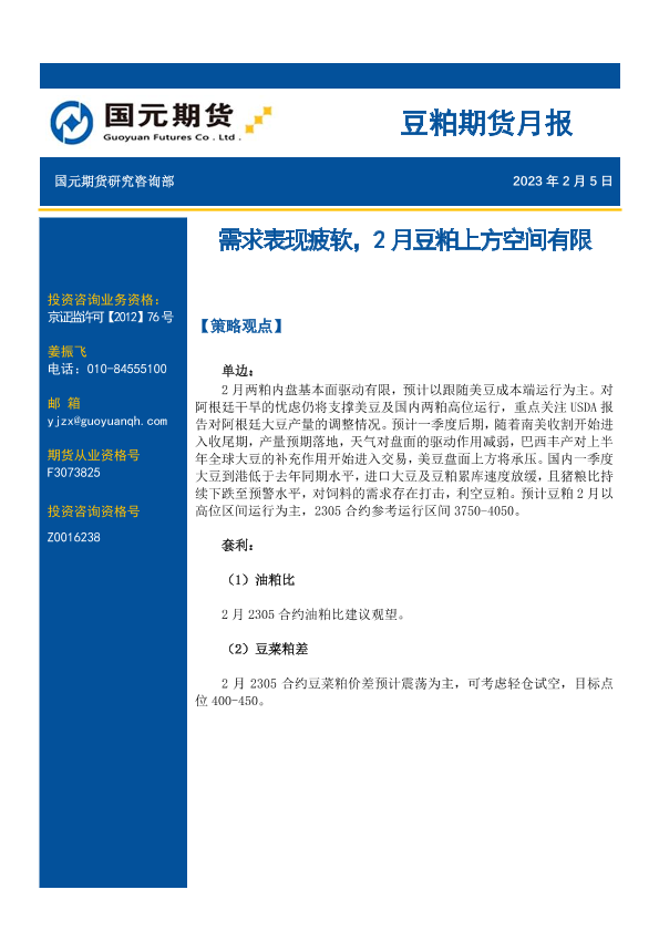【国元期货】【20230205】豆粕期货月报:需求表现疲软,2月豆粕上方空间有限-16页