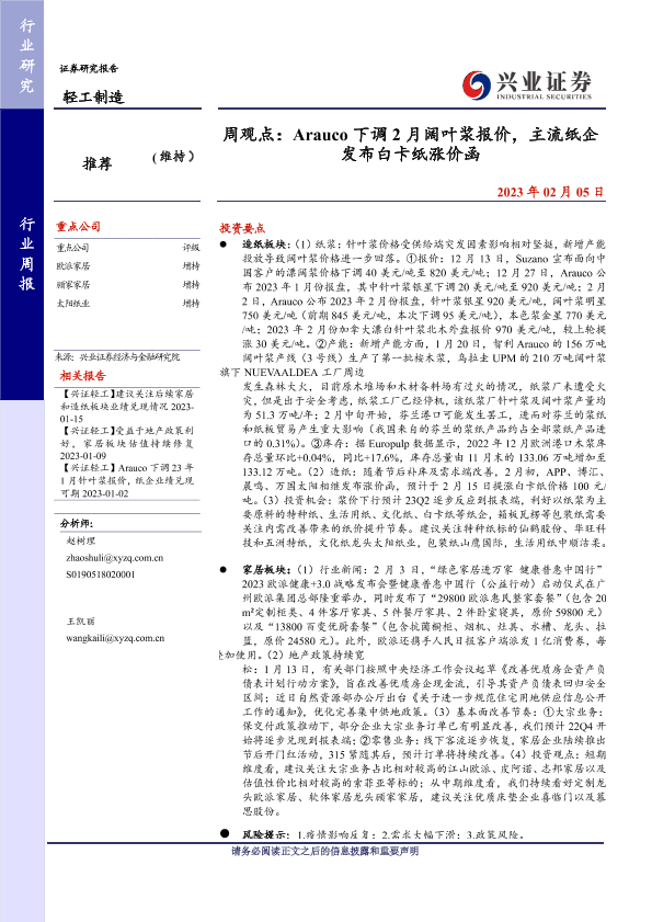 【兴业证券】【20230205】轻工制造周观点:Arauco下调2月阔叶浆报价,主流纸企发布白卡纸涨价函-21页