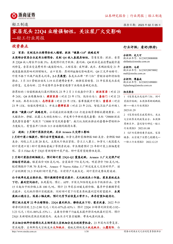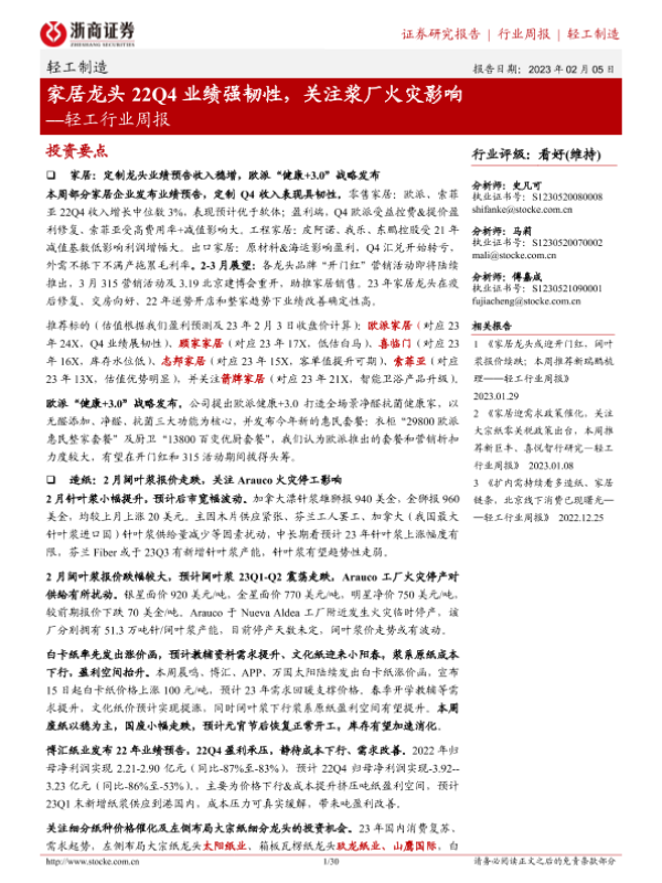 【浙商证券】【20230205】轻工行业周报:家居龙头22Q4业绩强韧性,关注浆厂火灾影响-30页