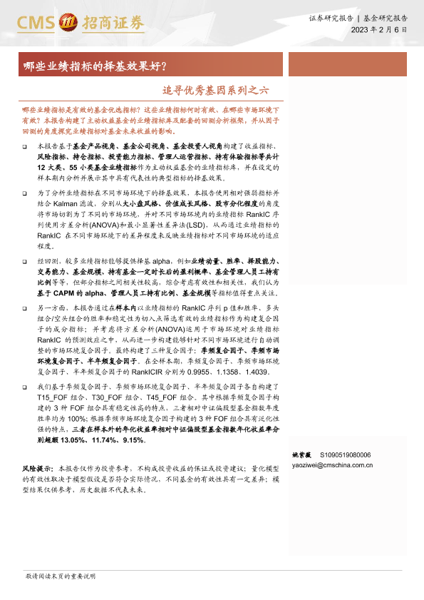 基金业绩指标 复合因子 市场环境适应性 择基策略 量化分析