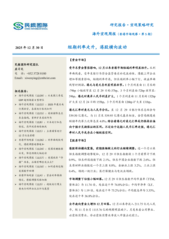 【民银国际研究团队】【202312】海外宏观周报(香港市场观察·第5期):短期利率走升,港股横向波动-9页
