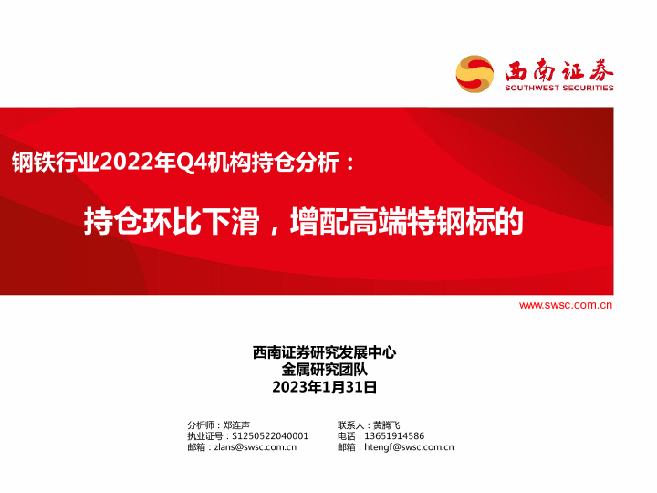 【西南证券】【20230131】钢铁行业2022年Q4机构持仓分析:持仓环比下滑,增配高端特钢标的-18页