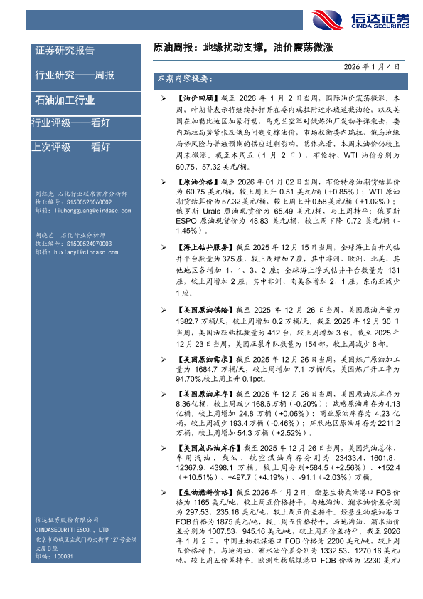 【信达证券】【202601】原油周报:地缘扰动支撑,油价震荡微涨-29页