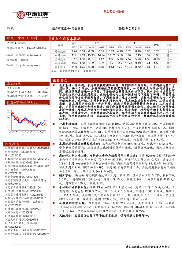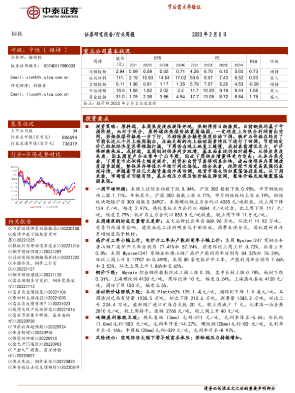 【中泰证券】【20230205】钢铁行业周报:节后需求待验证-17页