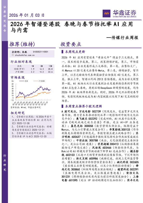 内需 AI应用 春节档 春晚 传媒行业
