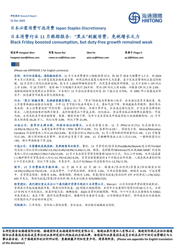 【海通国际】【202501】日本消费行业11月跟踪报告:“黑五”刺激消费,免税增长乏力-25页