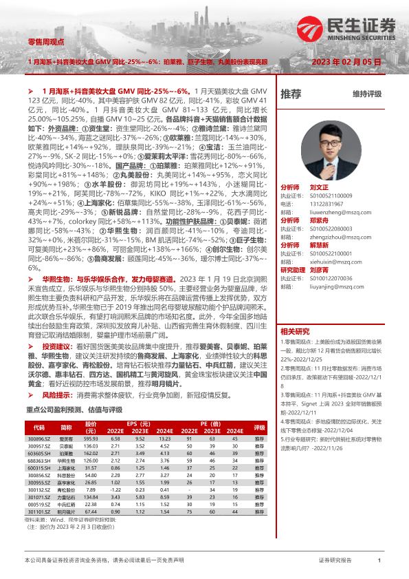 【民生证券】【20230205】零售周观点:1月淘系+抖音美妆大盘GMV同比-25%~-6%:珀莱雅、巨子生物、丸美股份表现亮眼-18页
