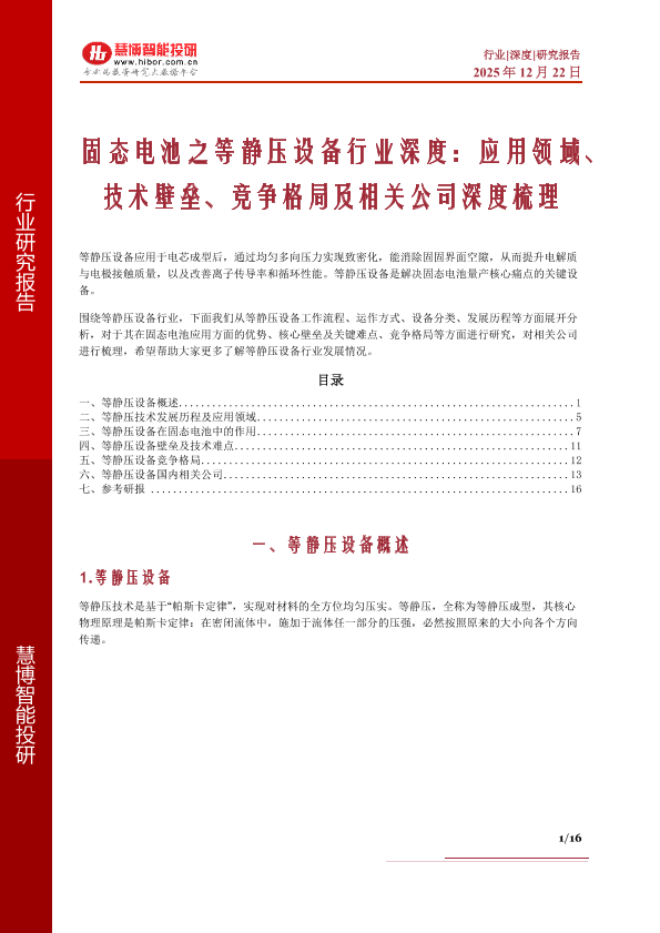 【慧博智能投研】【202512】固态电池之等静压设备行业深度:应用领域、 技术壁垒、竞争格局及相关公司深度梳理-16页