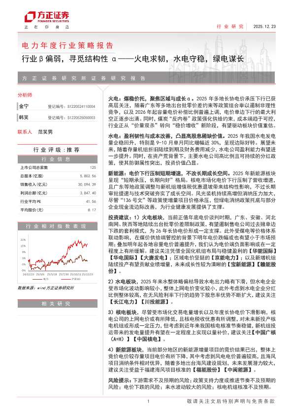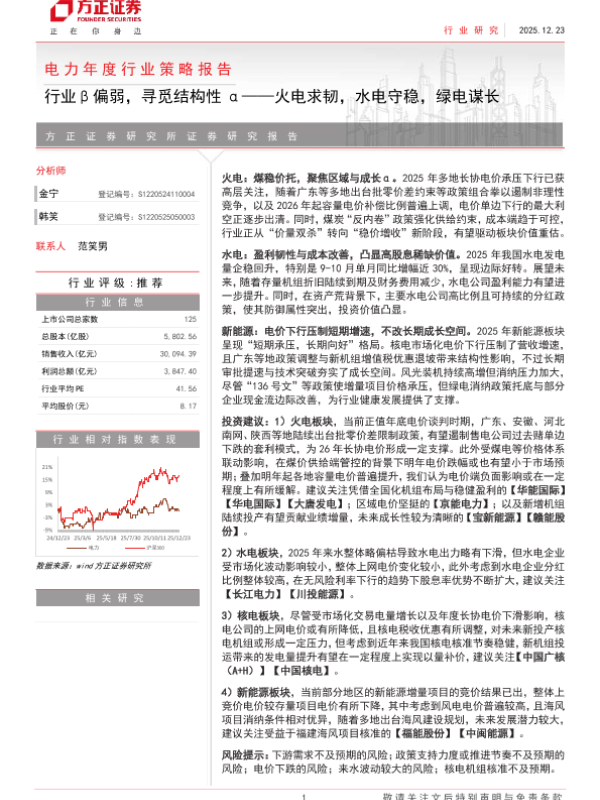 【方正证券】【202512】电力年度行业策略报告:行业β偏弱,寻觅结构性α——火电求韧,水电守稳,绿电谋长-32页