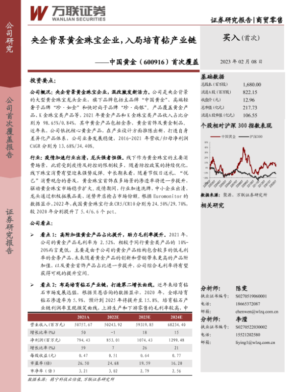 培育钻石 央企背景 渠道拓展 盈利预测 黄金珠宝