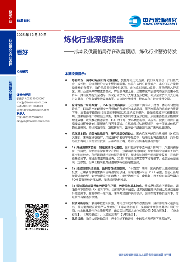 【申万宏源】【202512】炼化行业深度报告:成本及供需格局存在改善预期,炼化行业蓄势待发-54页