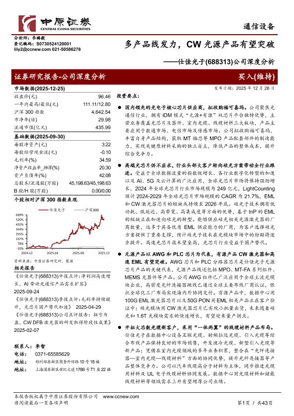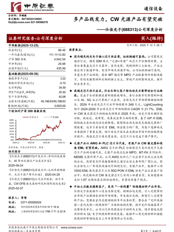 【中原证券】【202512】多产品线发力,CW光源产品有望突破——仕佳光子(688313)公司深度分析-43页
