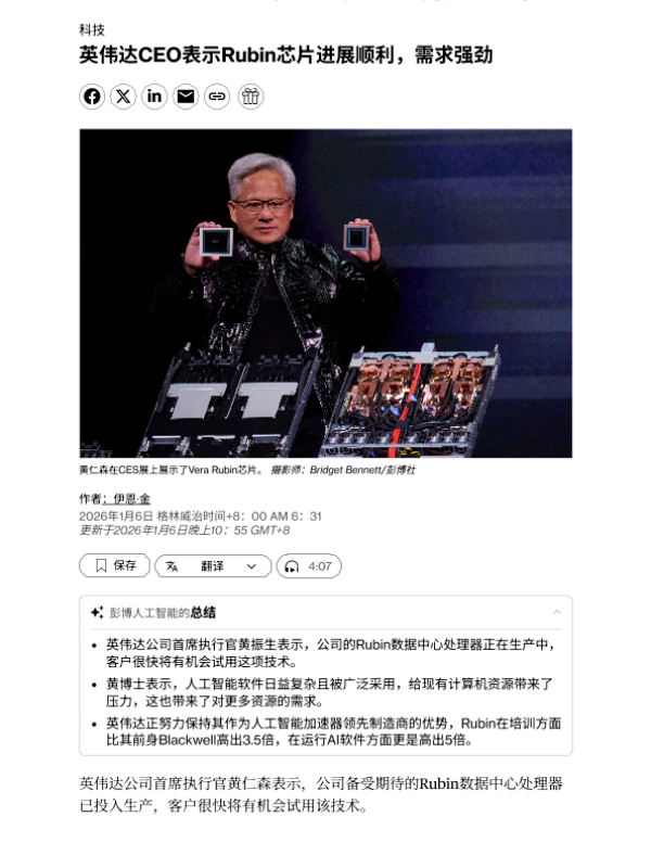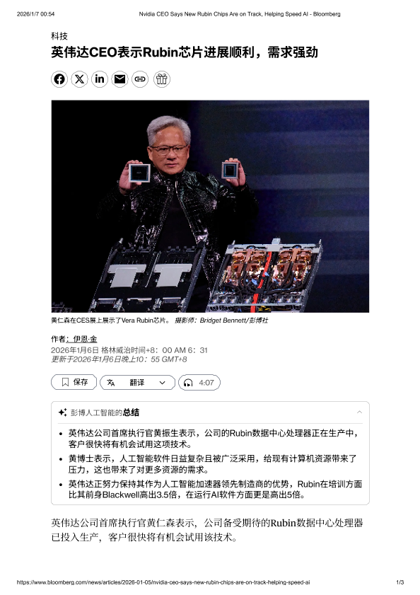 【彭博社】【202601】英伟达CEO表示Rubin芯片进展顺利,需求强劲-3页