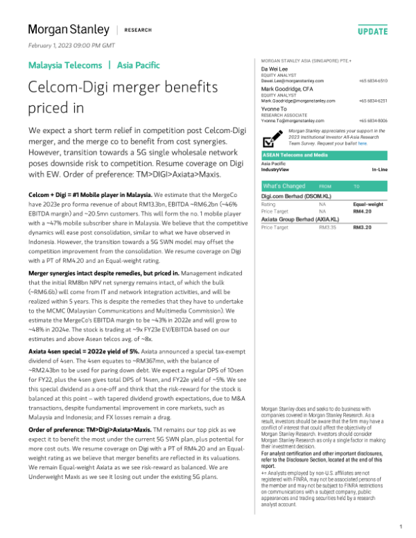 【Morgan Stanley】【20230201】Morgan Stanley-Malaysia Telecoms Celcom-Digi merger benefits priced in-30页