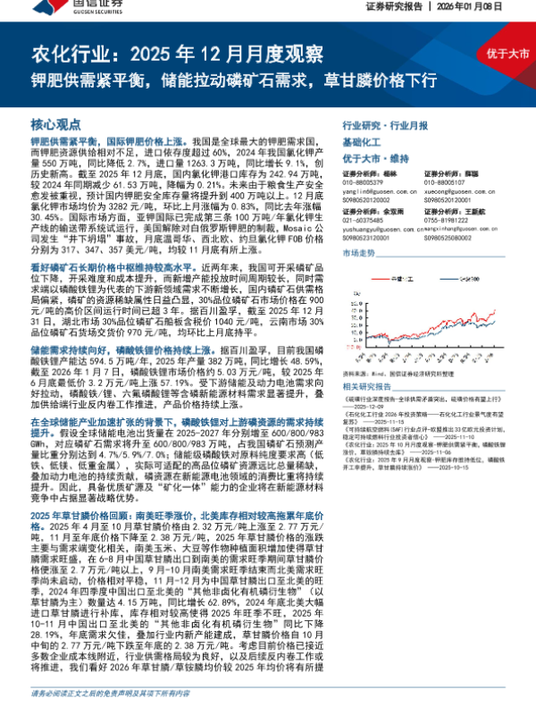 【国信证券】【202601】农化行业:2025年12月月度观察:钾肥供需紧平衡,储能拉动磷矿石需求,草甘膦价格下行-32页