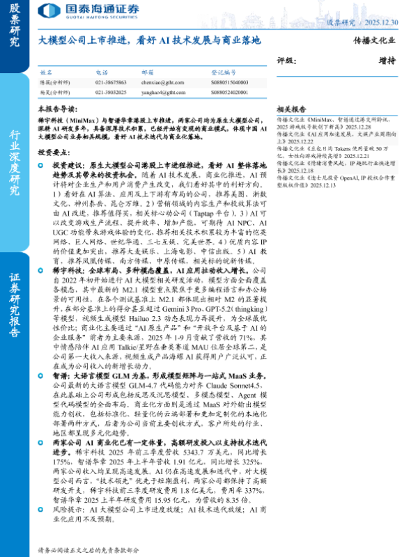 【国泰海通证券】【202512】大模型公司上市推进,看好 AI技术发展与商业落地-33页