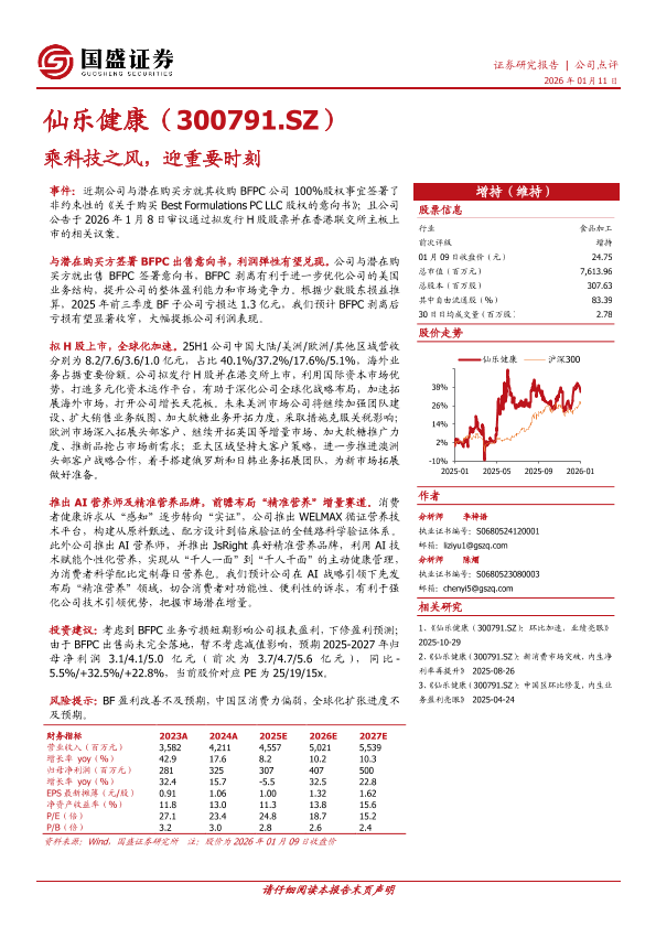 BFPC剥离 精准营养 AI营养师 仙乐健康 H股上市