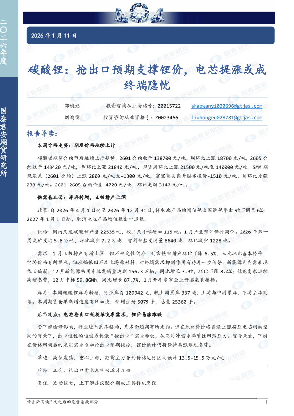 【国泰君安期货】【202601】碳酸锂:抢出口预期支撑锂价,电芯提涨或成终端隐忧-9页