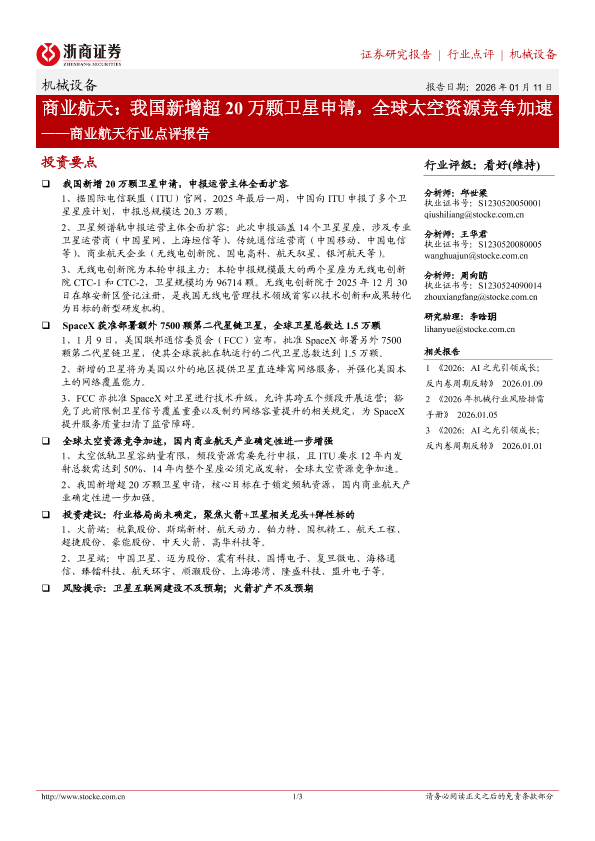 【浙商证券】【202601】商业航天:我国新增超 20万颗卫星申请,全球太空资源竞争加速——商业航天行业点评报告-3页