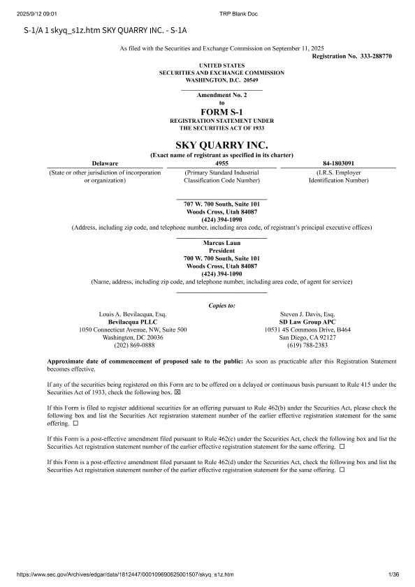【Sky Quarry Inc.】【202509】SKY QUARRY INC. - S-1A-36页