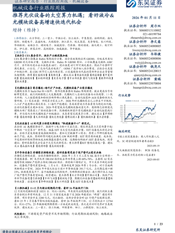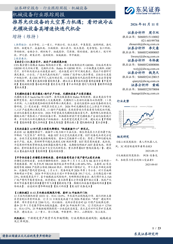 【东吴证券】【202601】推荐光伏设备的太空算力机遇;看好液冷&光模块设备高增速快迭代机会-23页