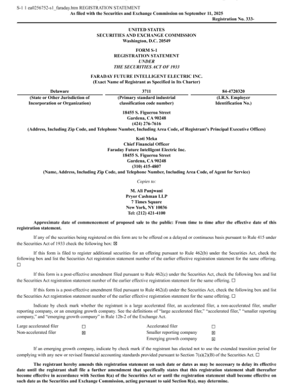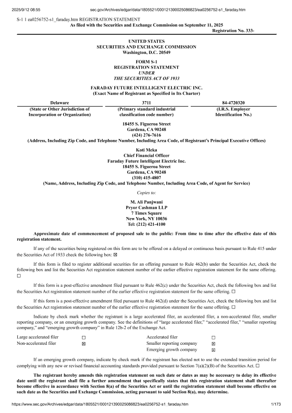 【Faraday Future Intelligent Electric Inc. (FFAI&FFAIW)】【September 10, 2025】FARADAY FUTURE INTELLIGENT ELECTRIC INC (FFAI, FFAIW) 9/12 208 205-173页