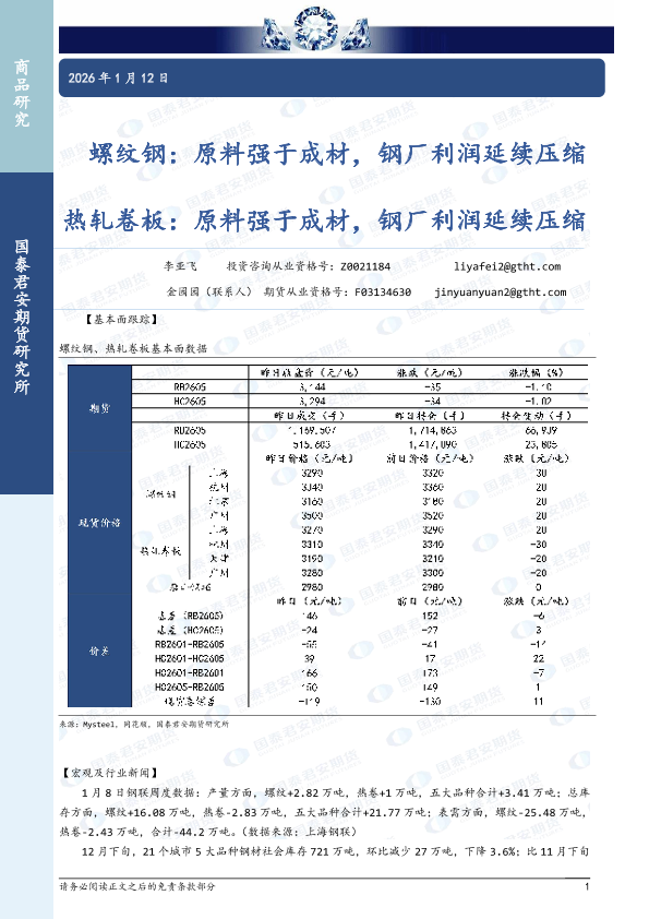 【国泰君安期货】【202601】螺纹钢:原料强于成材,钢厂利润延续压缩 热轧卷板:原料强于成材,钢厂利润延续压缩-3页