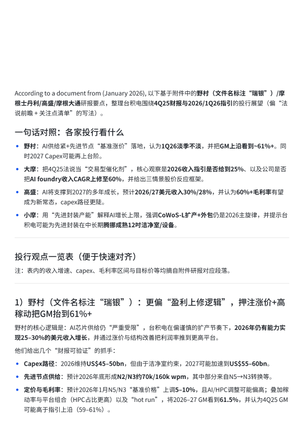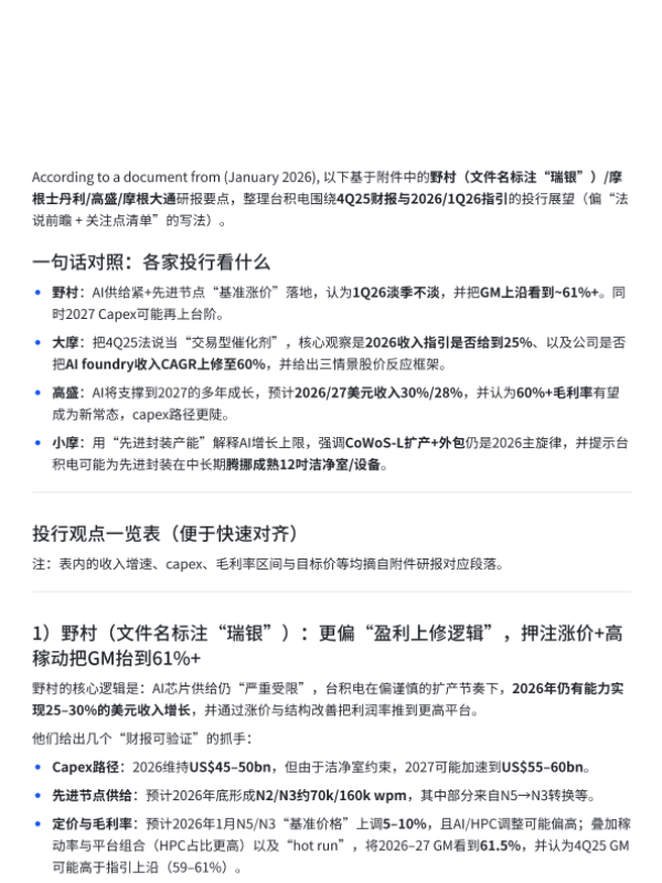 【野村&摩根士丹利&高盛&摩根大通】【202601】台积电4Q25财报与2026-1Q26指引投行展望-4页