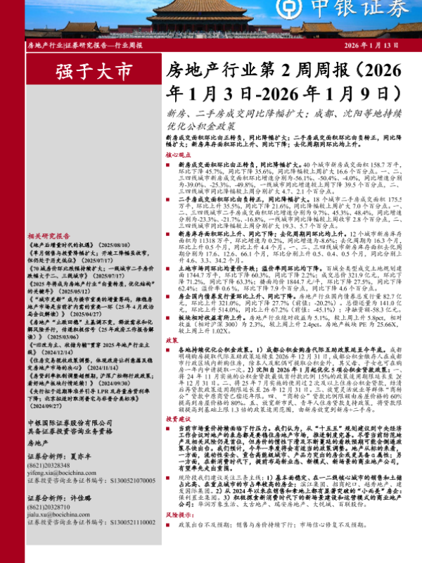 【中银证券】【202601】房地产行业第2周周报:新房、二手房成交同比降幅扩大;成都、沈阳等地持续优化公积金政策-24页