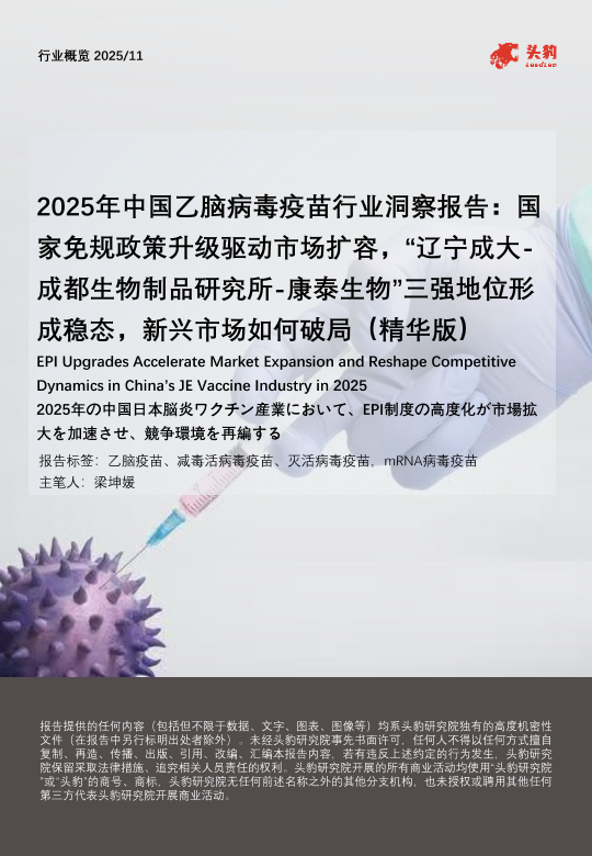 【头豹研究院】【202511】2025年中国乙脑病毒疫苗行业洞察报告:国家免规政策升级驱动市场扩容,“辽宁成大-成都生物制品研究所-康泰生物”三强地位形成稳态,新兴市场如何破局(精华版)-23页
