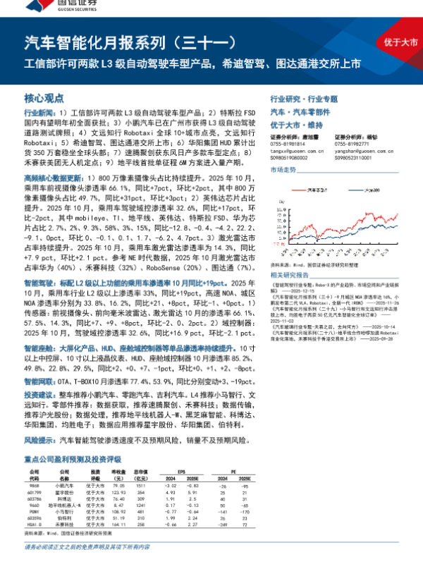 【国信证券】【202512】汽车行业智能化月报系列(三十一):工信部许可两款L3级自动驾驶车型产品,希迪智驾、图达通港交所上市-64页