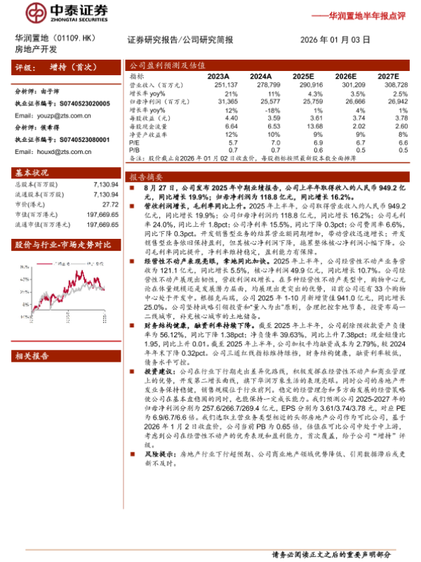【中泰证券】【202601】华润置地(1109.HK)半年报点评:收入利润增长,经营性不动产韧性凸显-10页