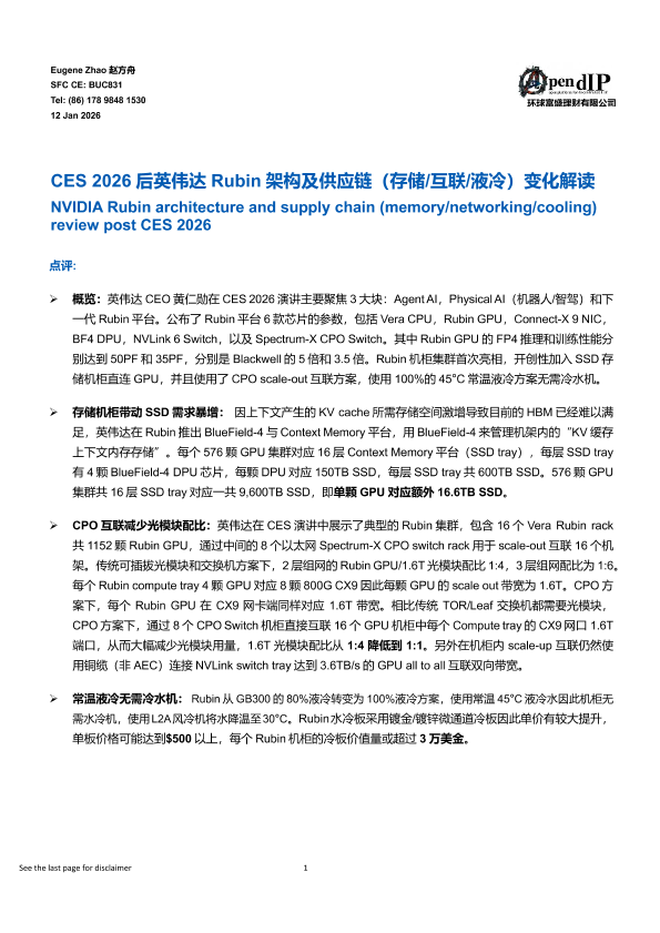 【环球富盛理财有限公司】【202601】CES 2026后英伟达 Rubin架构及供应链(存储/互联/液冷)变化解读-4页