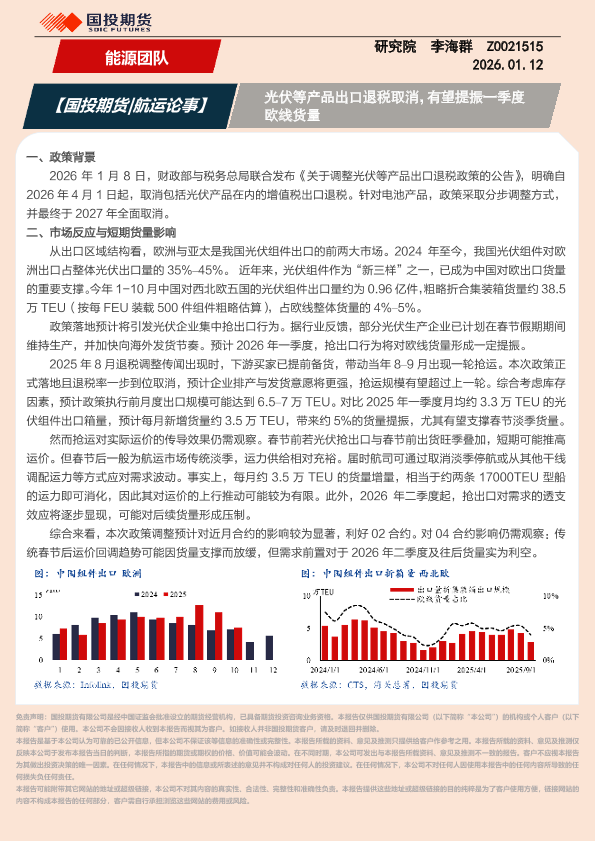 【国投期货】【202601】光伏等产品出口退税取消,有望提振一季度 欧线货量-1页