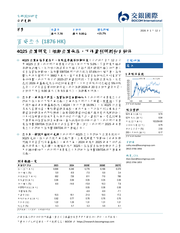【交银国际】【202601】百威亚太(1876 HK)4Q25业绩预览:短期业绩承压,下调盈利预测和目标价-7页