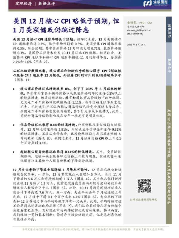 【浦银国际】【202501】美国12月核心CPI略低于预期,但1月美联储或仍跳过降息-7页