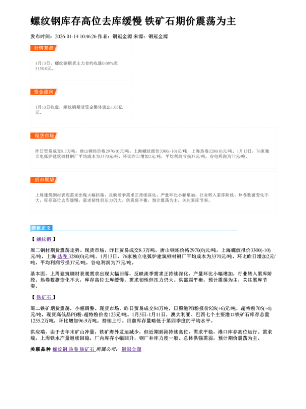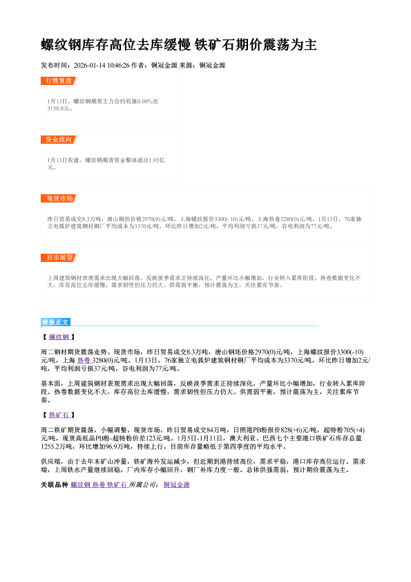 【铜冠金源期货】【202601】螺纹钢库存高位去库缓慢 铁矿石期价震荡为主-1页